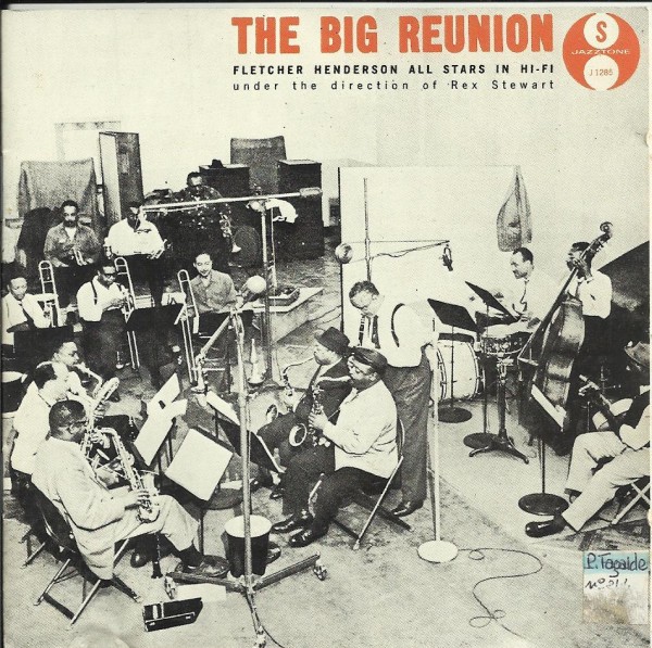 Autre rencontre, ou plutôt retrouvaille historique. La Big Reunion de 1957!. Le cornettiste Rex Stewart a réuni en studio plusieurs anciens de la formation de Fletcher Henderson. Une incroyable pléiade de très grands du jazz sur un même splendide enregistrement . Juste pour la route.. Coleman Hawkins, Ben Webster, Al Casey, Dickie Wells!…. Ce disque, paru avec la célèbre pochette de studio ci-contre chez Fresh sound, est ressorti chez nos disquaires sous le nom d’accroche » « Cool fever! » , avec en couverture! une pépée dénudée au milieu d’instruments de musique. Ce n’est pas pour le supermarché du coin !…. C’est pour vous!…si vous n’avez pas encore l’enregistrement culte. On le trouve partout et notamment sur Amazon! … Vous l’avez remarqué et désolé pour les lubriques … je vous reproduis ici la photo originale de l’orchestre. On voit bien Hawkins et Webster, avec debout derrière eux le clarinettiste Buster Bailey. En haut de la photo, Rex Stewart (en chemise étoilée!) surveille bien les opérations.